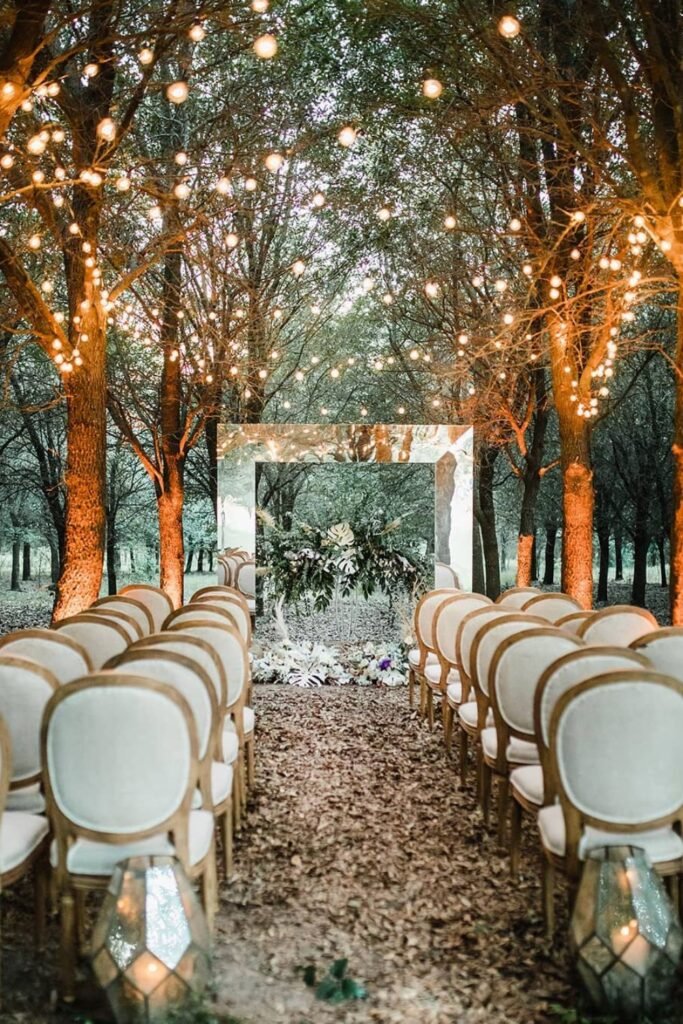 Wrap warm string lights loosely around trunks and let them cross overhead like stars. Keep the ground natural with leaves or mulch.