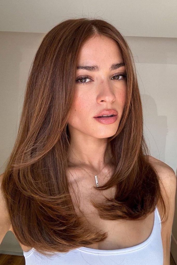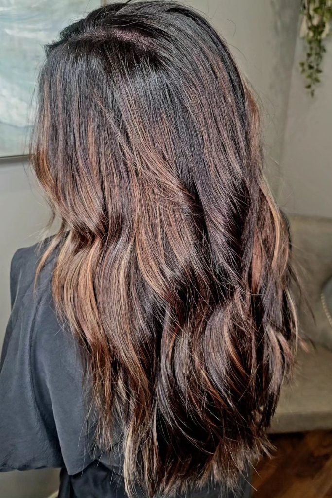 This color suits brunettes wanting some brightness while keeping their natural richness. Achieving this look uses balayage for seamless blending.
