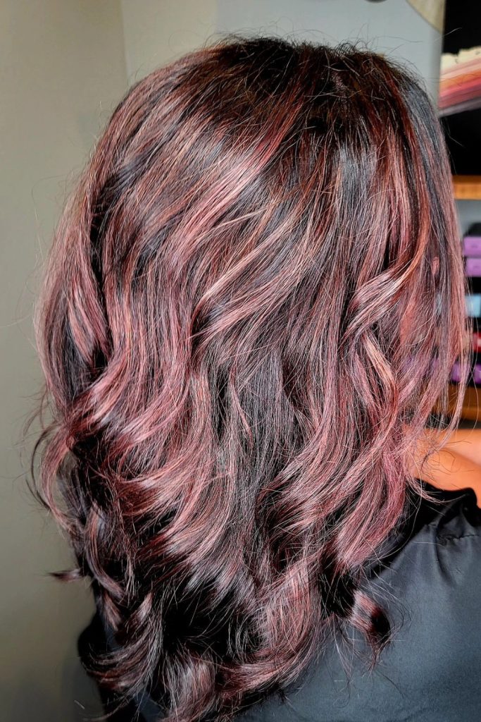 The rose gold highlights are softly blended into the hair, making it shimmer in the light. Loose waves show off the color nicely.