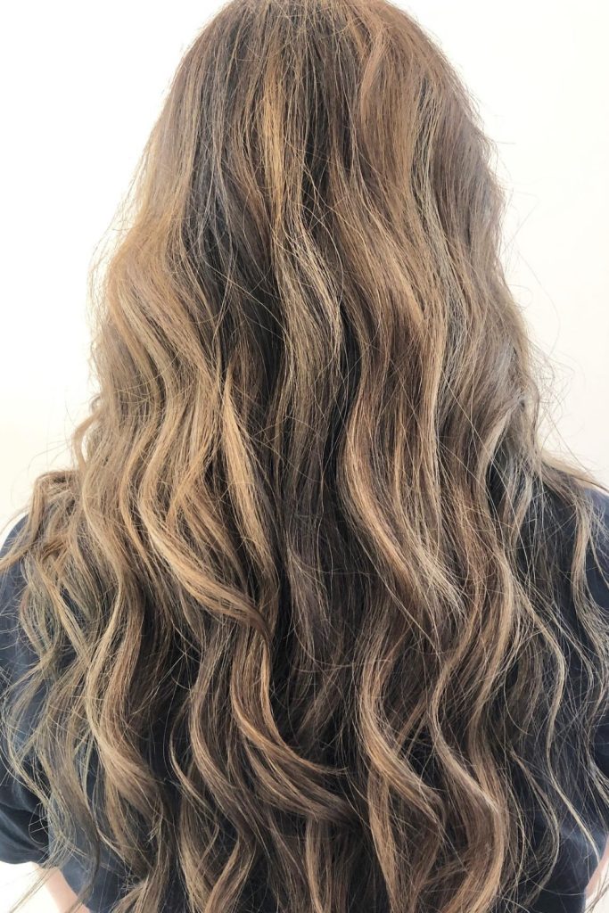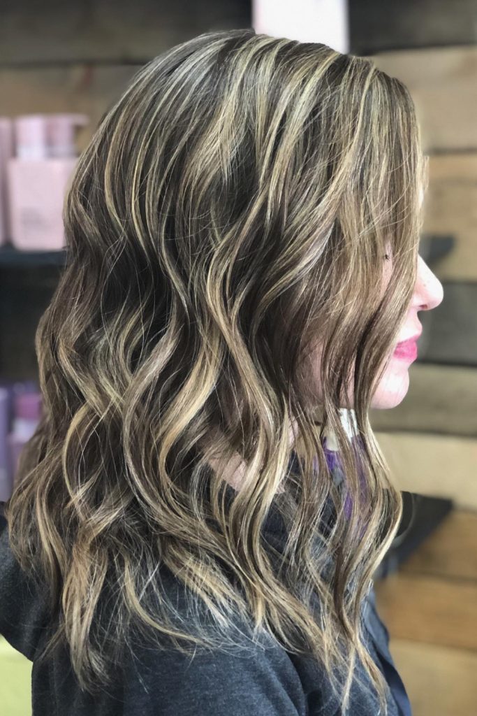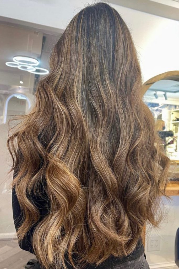 The highlights are placed to make long, wavy hair look more lively and textured. This color brightens your hair while still looking natural.
