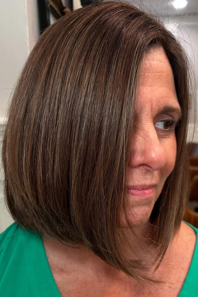 To get this style, ask for fine, hand-painted highlights that blend well with the mocha base. Regular trims will keep the bob sharp and the color looking fresh.