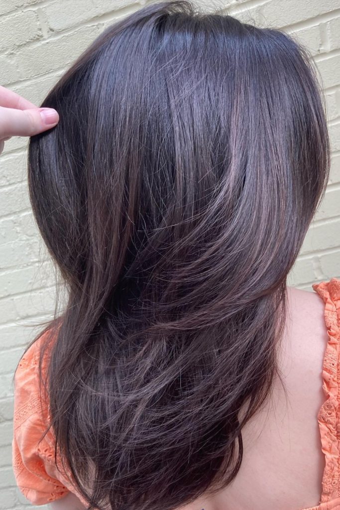 The hair is cut into long layers, letting the color flow nicely from roots to ends. This creates a soft yet noticeable contrast that adds movement and texture.