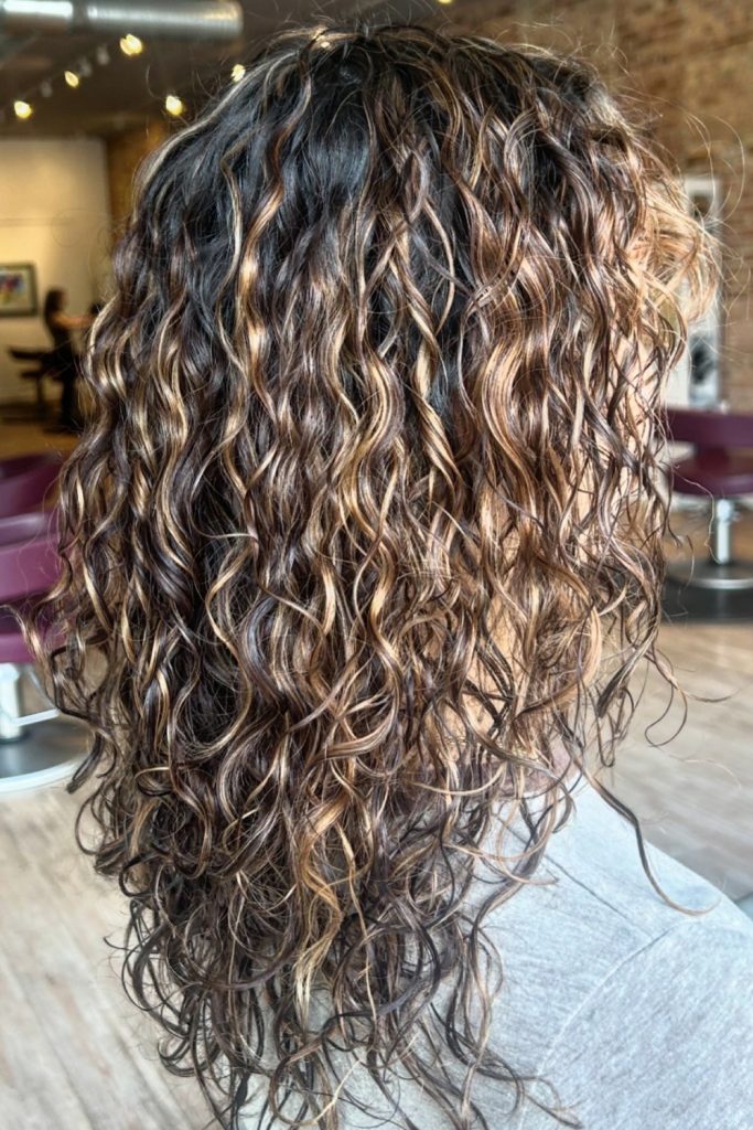 To get this style, a stylist uses a balayage technique to add highlights that match the curl pattern.