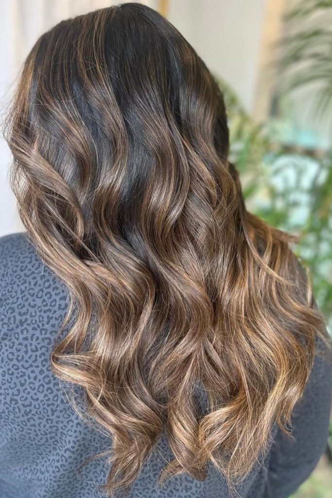 The balayage technique blends the highlights smoothly with the natural brunette color for a natural look.