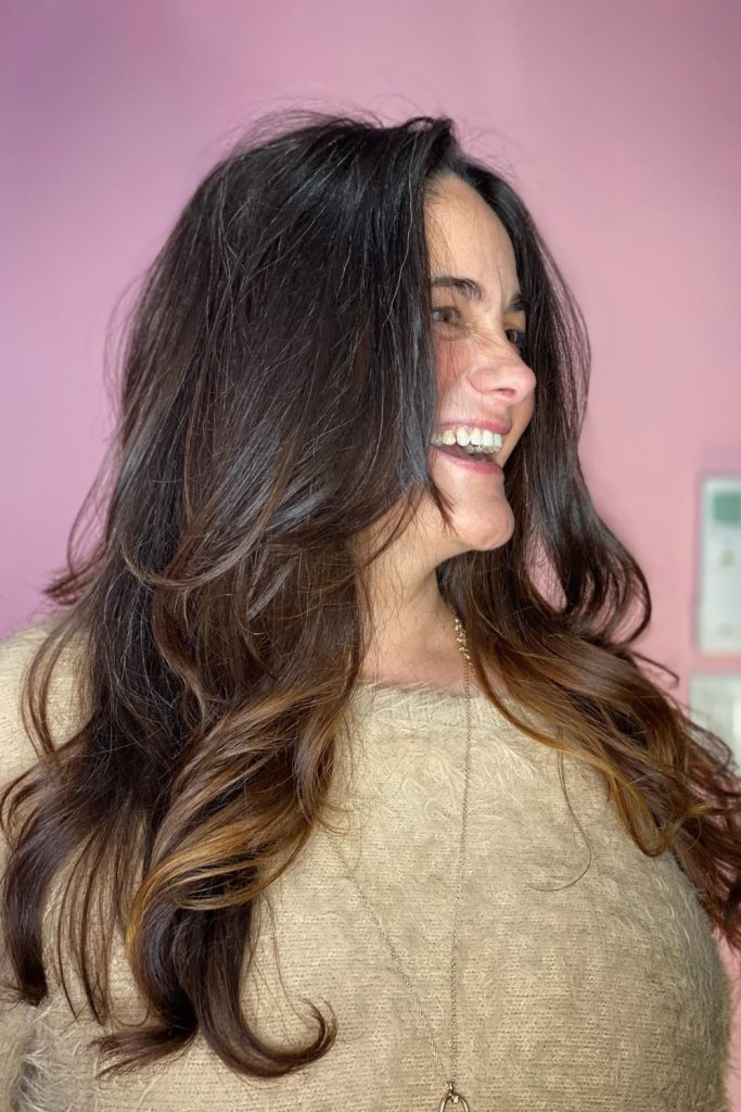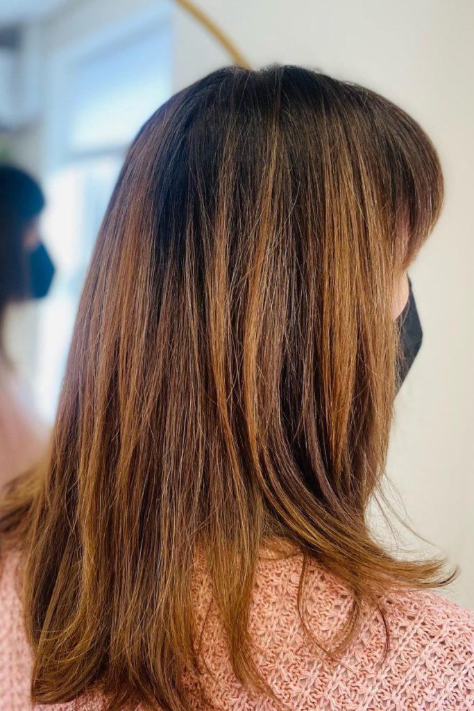 The cut includes soft layers at the ends to show off the color’s movement. To keep this style, use a sulfate-free shampoo to maintain the warmth and avoid fading.