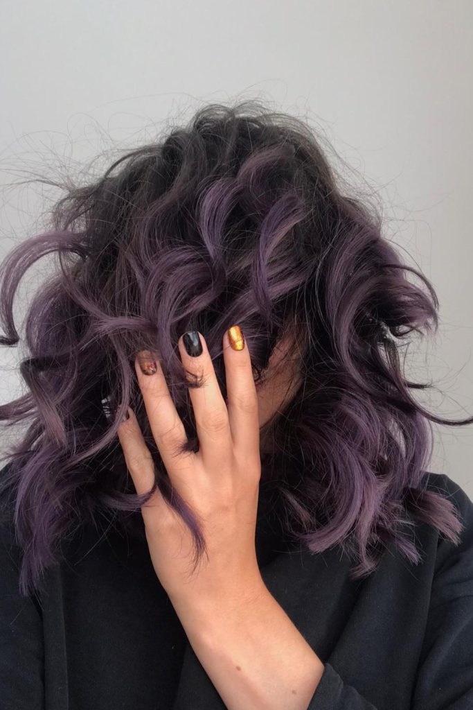 The color covers the hair evenly, making sure every curl pops with violet. It’s a fun style for those who want to stand out.