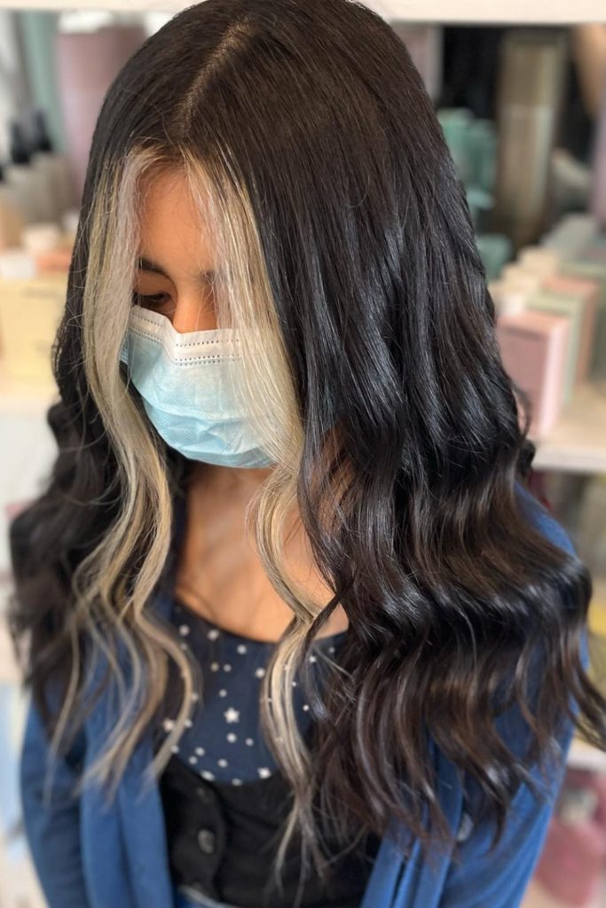 Platinum Streaked Noir is a bold and stylish choice for fall hair color, especially for brunettes. It features a rich black base with standout platinum blonde streaks around the face.