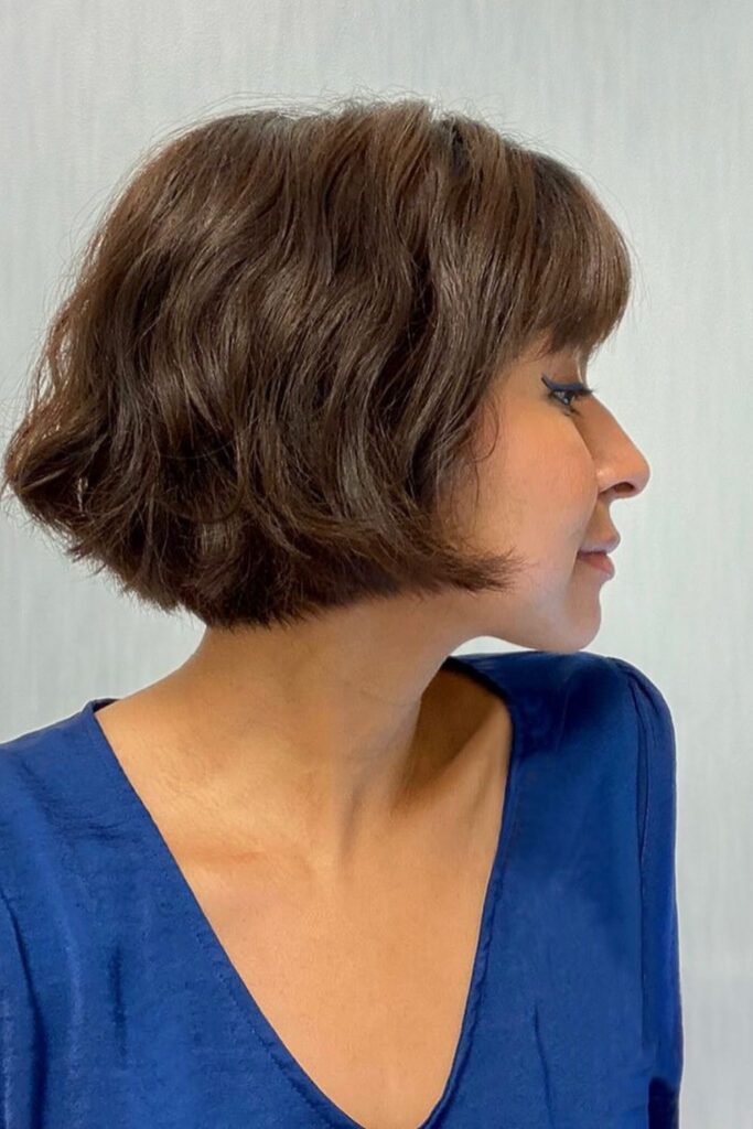 Think about requesting a French bob, complemented by wispy bangs that barely touch the eyebrows, letting them merge seamlessly.