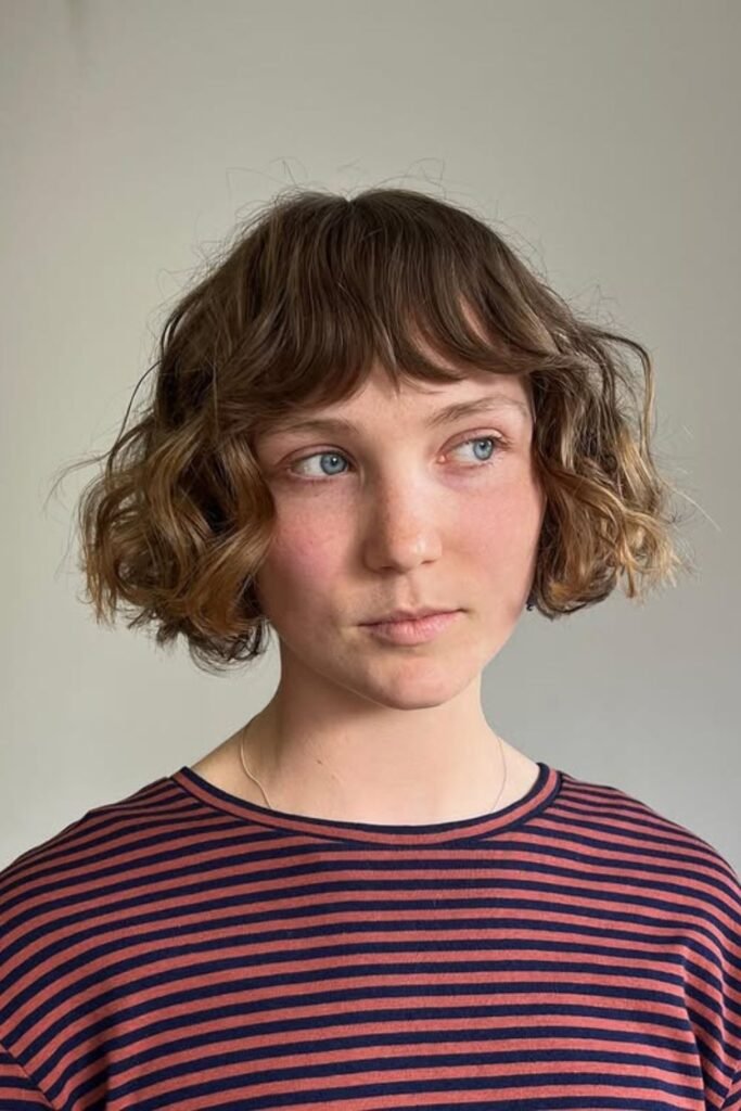 Natural curls change the rules of a French bob. Short length keeps the shape light, while a soft, broken fringe stops the curls from crowding the face.