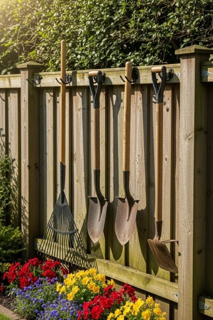 Instead of wasting fence space, I turned it into a tool wall. I screw sturdy hooks directly into the fence posts and hang tools vertically.