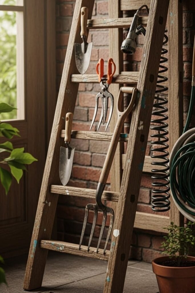 An old wooden ladder became useful again once I leaned it against the wall. Each rung holds tools at different heights, which keeps them separated and visible.