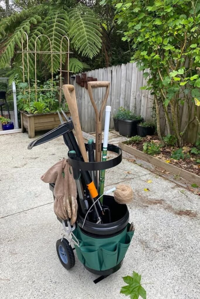Recreating it starts with a sturdy bucket, a tool organizer wrap, and a small dolly or garden cart base. Keeping only task-specific tools inside prevents overload.