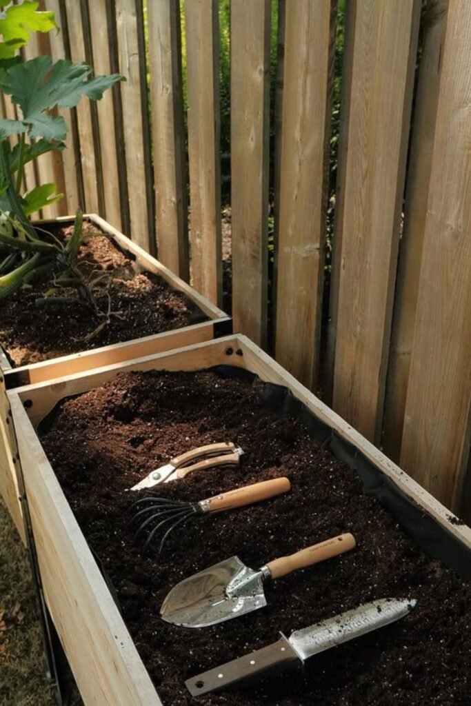 Planting flows better once hand tools stay exactly where the work happens. Raised beds like these double as temporary tool stations.