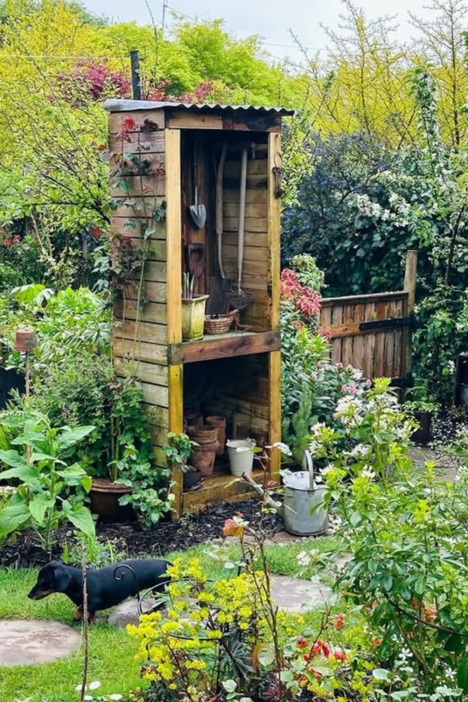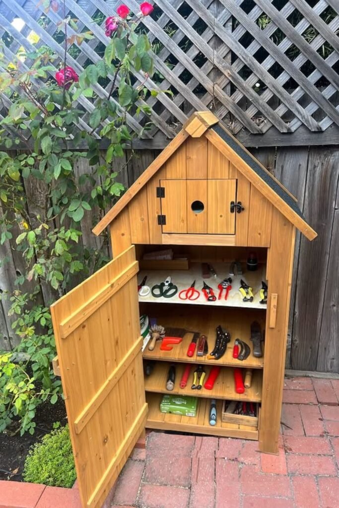 Small gardens benefit most from storage that stays compact but purposeful. A wooden hutch like this keeps hand tools.