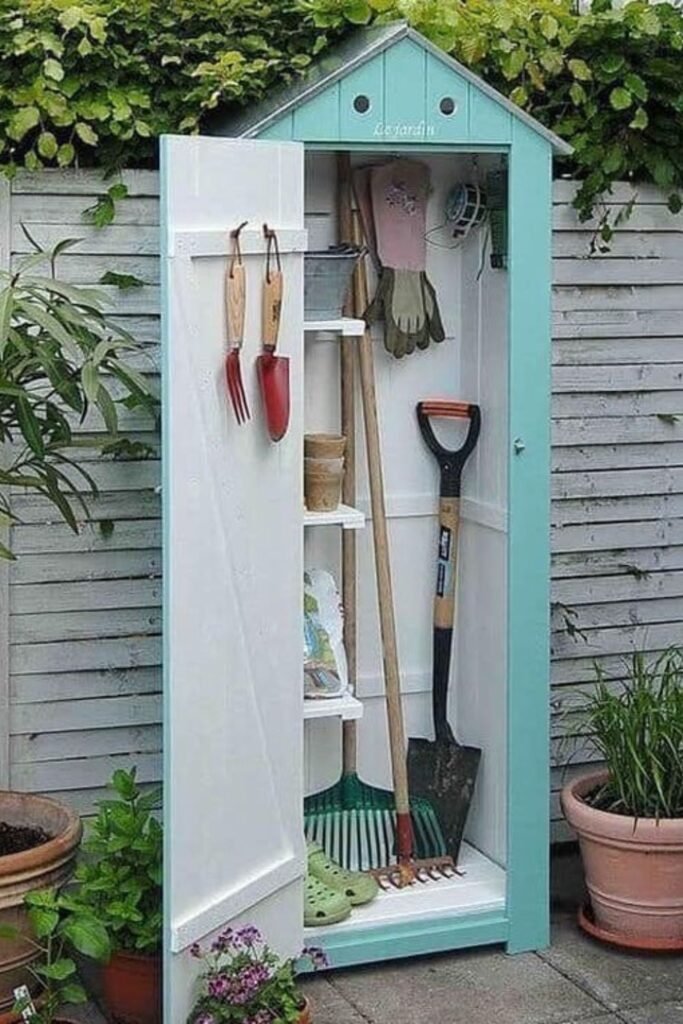 Adding hooks on the door keeps daily tools within reach. Perfect for small gardens where a full shed feels unnecessary but organization still matters.