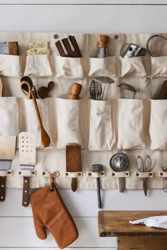 prevents wooden handles from warping, and lets everything dry properly after use. A simple metal rack or heavy-duty hooks mounted.