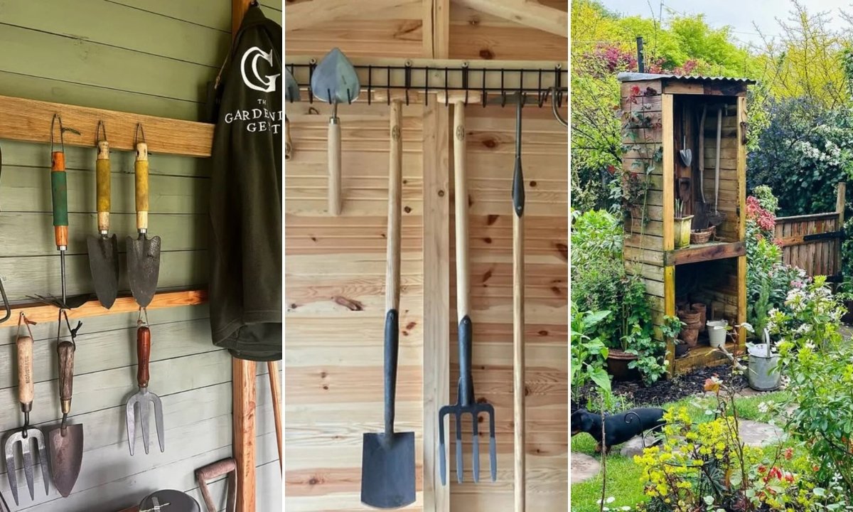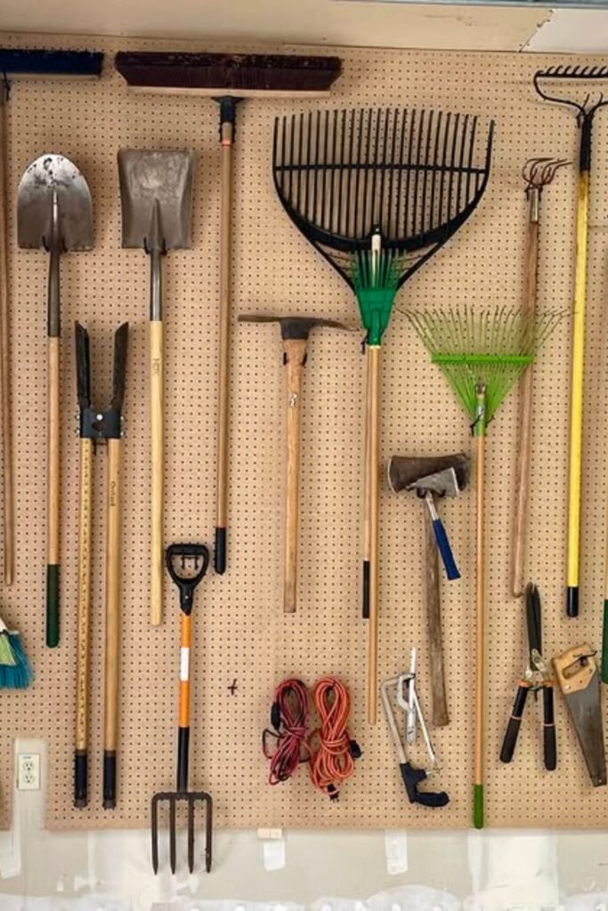 Hanging pruners, forks, or trowels on a shed or cabinet door keeps blades dry and easy to grab during quick tasks.