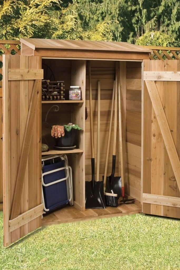 A narrow outdoor cabinet like this works perfectly inside flower beds or along garden paths. Wooden panels help tools breathe.
