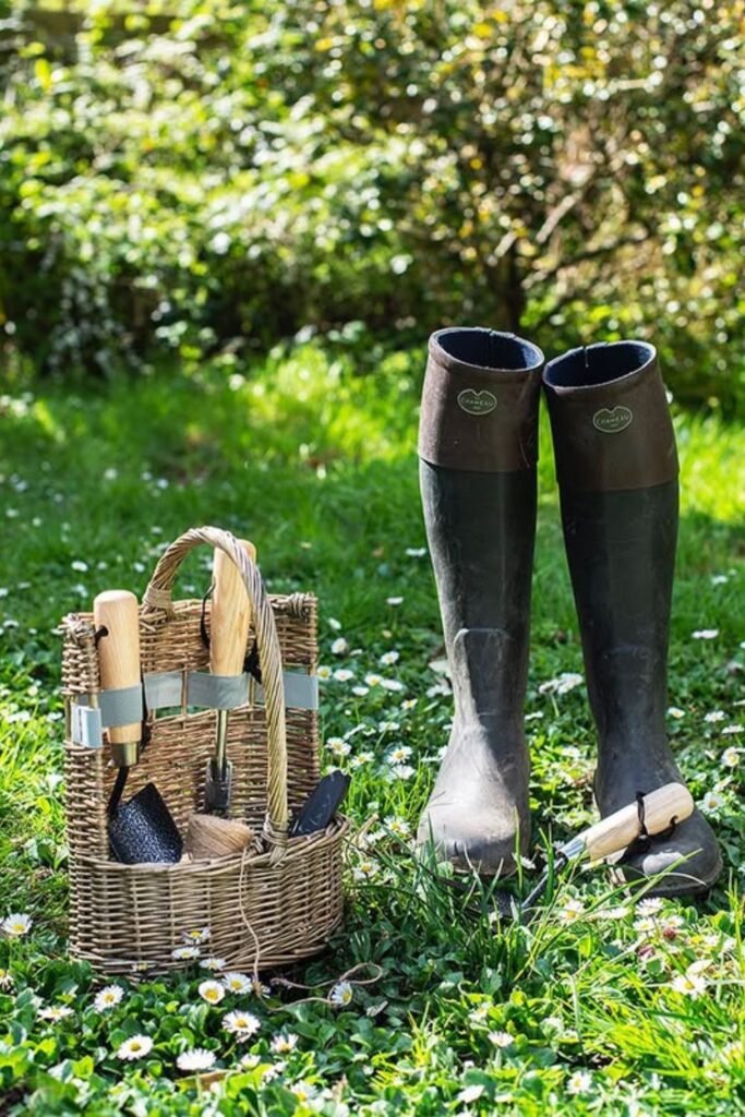 A sturdy basket like this works perfectly for hand tools, gloves, twine, and small harvests. Natural materials such as wicker or rattan keep it lightweight while handling dirt well.