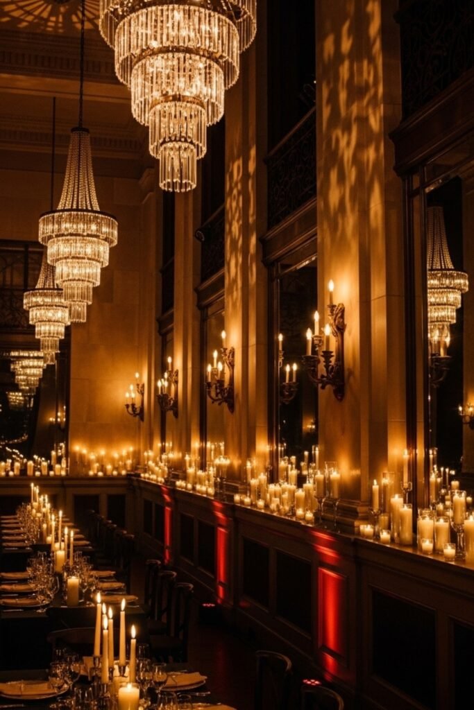 You have to layer chandeliers, sconces, and candles so shadows feel intentional and the space feels intimate for guests all evening.