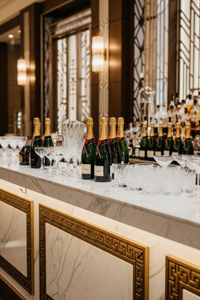 Once styled with glassware and signage, the bar feels immersive, polished, and perfectly aligned with Gatsby era sophistication all night.