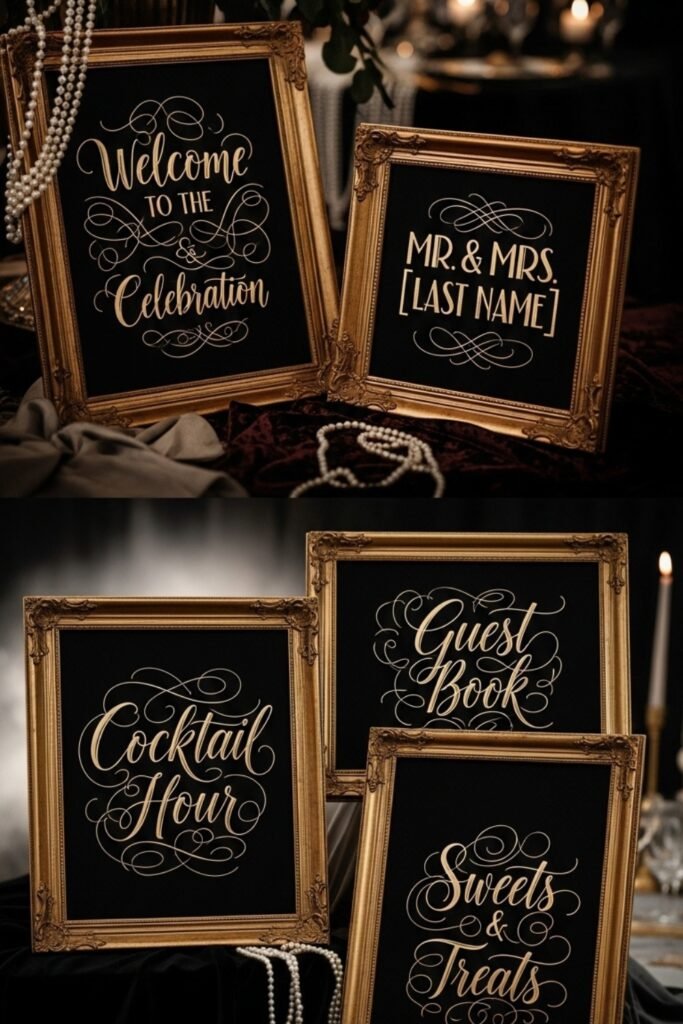 Once framed with gold or mirrors, calligraphy signs blend seamlessly into a Gatsby setting while guiding guests stylishly throughout.