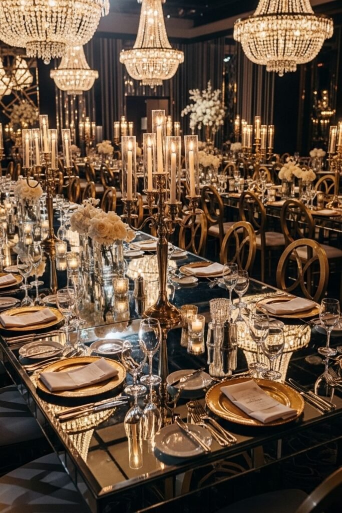 Once paired with candles and glassware, mirrored surfaces reflect warmth beautifully and elevate the Gatsby mood across the reception space.