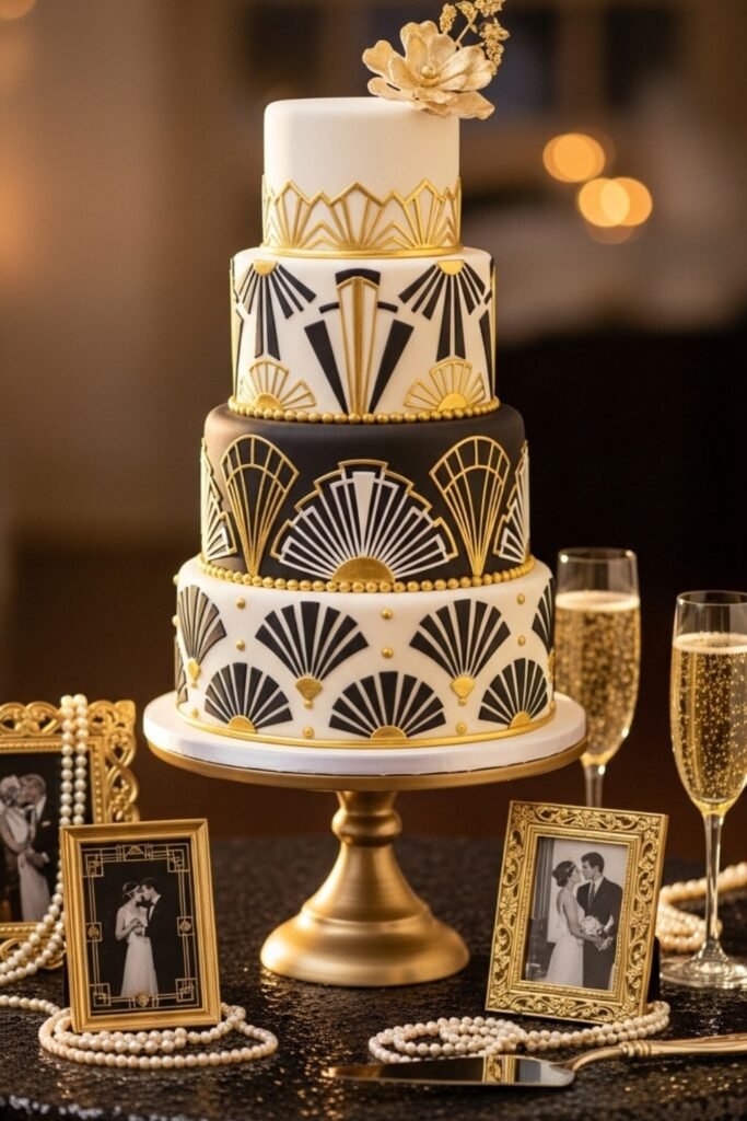 A retro cake brings the Gatsby theme straight to the dessert table, blending vintage charm with bold design details guests instantly notice.