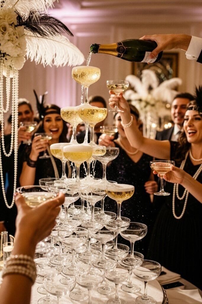 If you want a show stopping moment, a champagne tower creates instant celebration energy as glasses sparkle under soft evening lighting.
