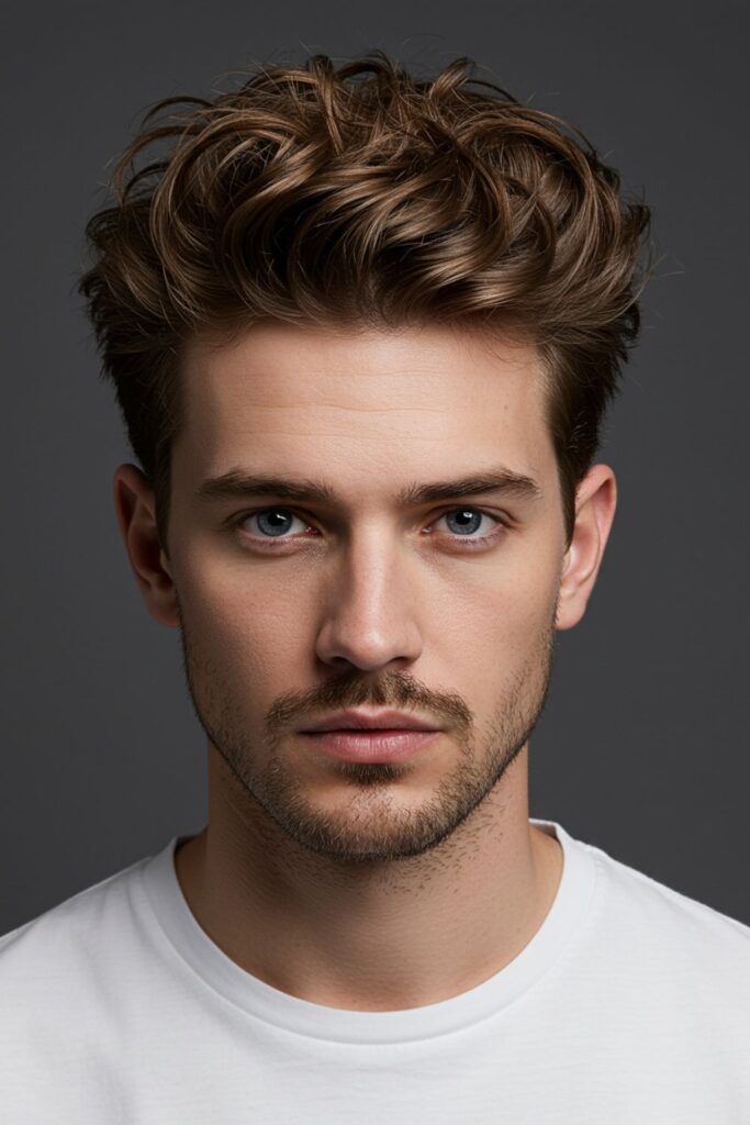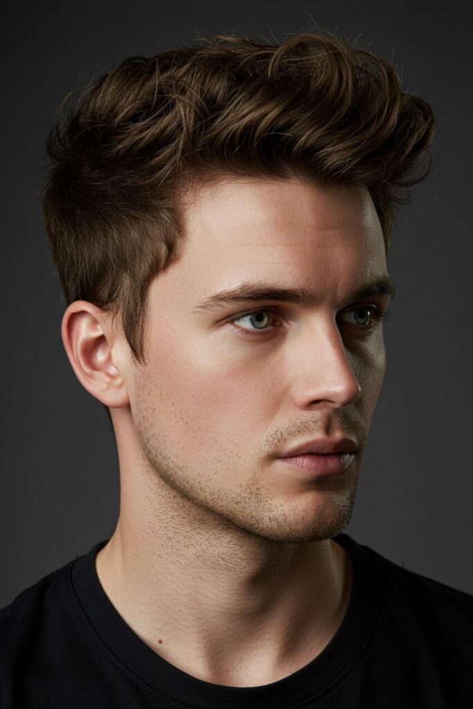 This look features short sides and a slightly longer top styled with messy, natural texture.