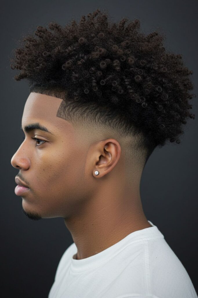 The sides are cut into a crisp fade, drawing attention to the textured, full curls up top.