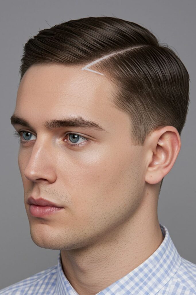 Achieve this look by creating a sharp, defined part on one side of your head.
