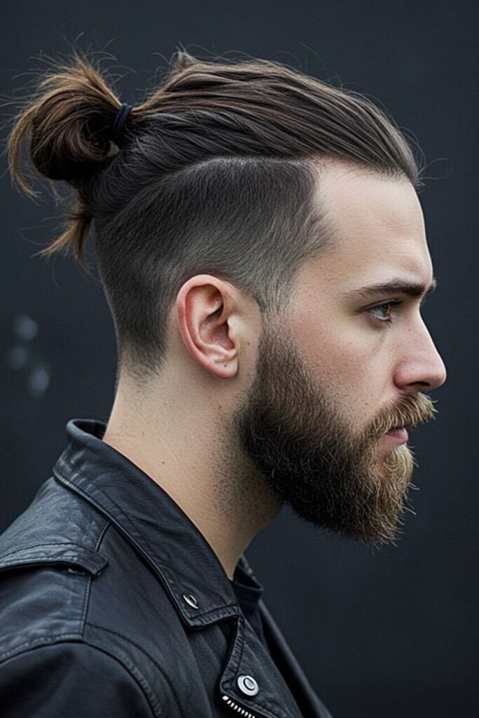 The top hair is gathered into a man bun, creating a sleek focal point, while the sides are tapered into a sharp fade to add contrast and structure.