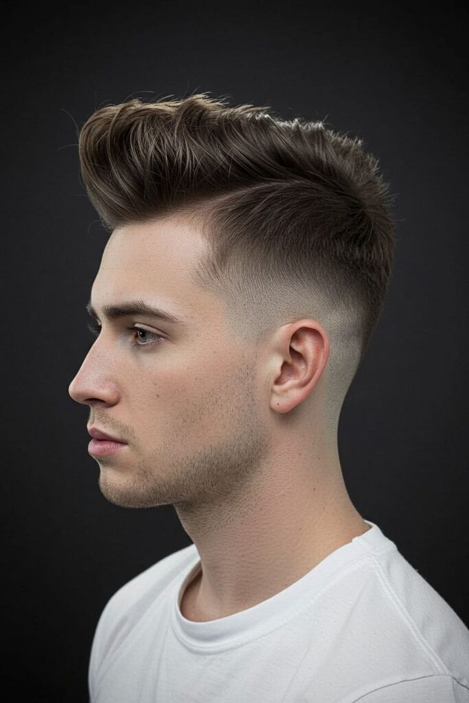 The top section is styled upward, creating a pointed faux hawk look, while the sides fade smoothly, adding a clean-cut finish.