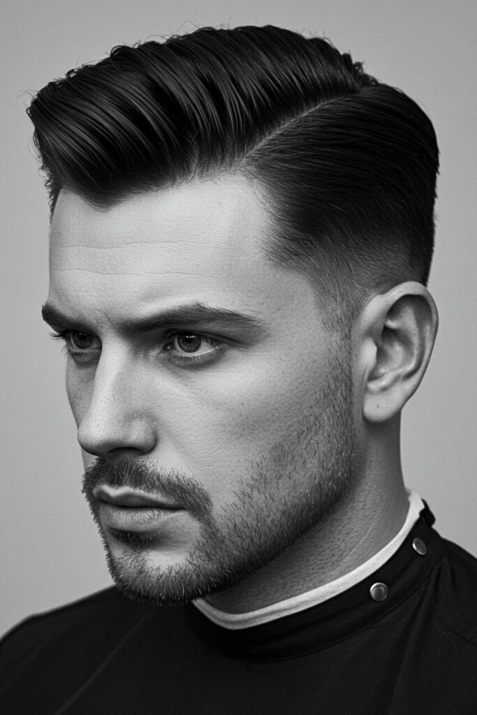 The slicked-back hair, styled with a strong-hold pomade, exudes clean sophistication while the dramatic fade around the sides showcases stark separation.