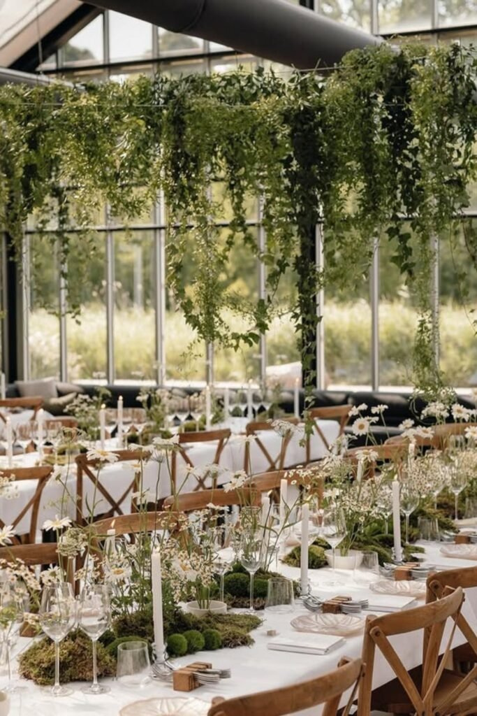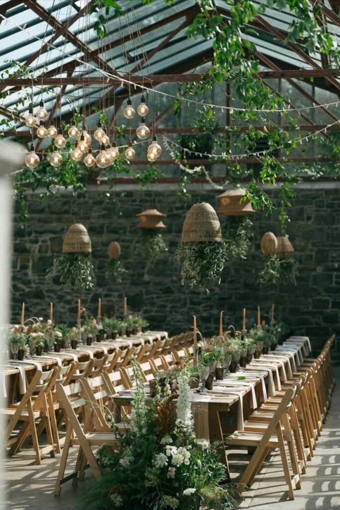 This greenhouse wedding reception uses hanging greenery to soften glass walls and create intimacy without crowding table surfaces for seated guests.