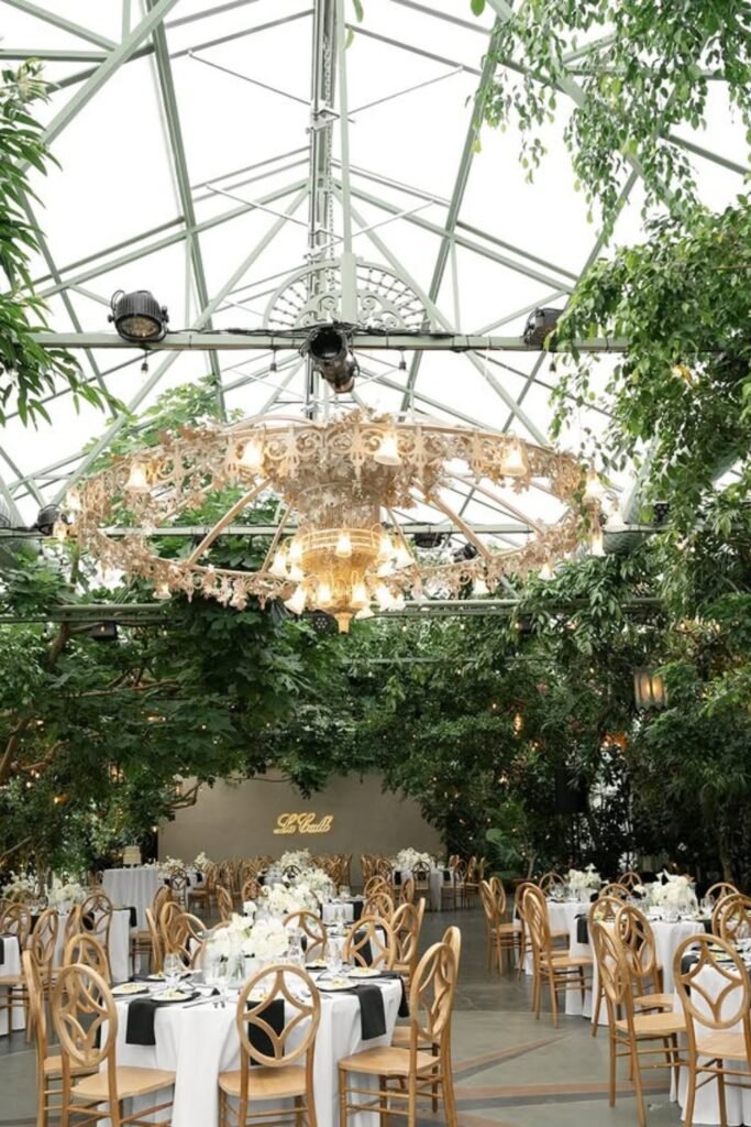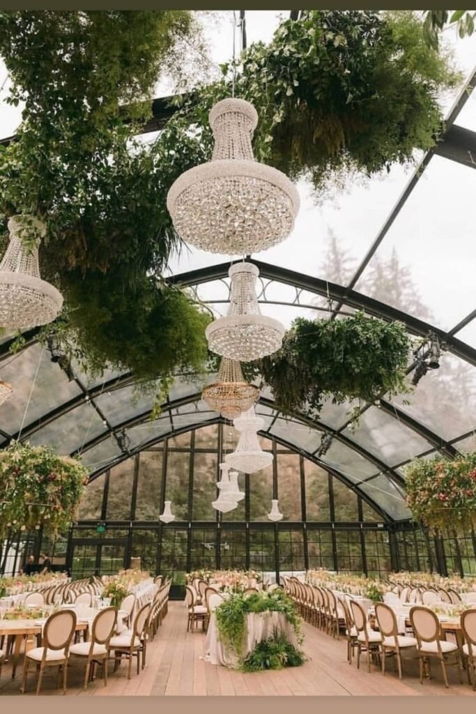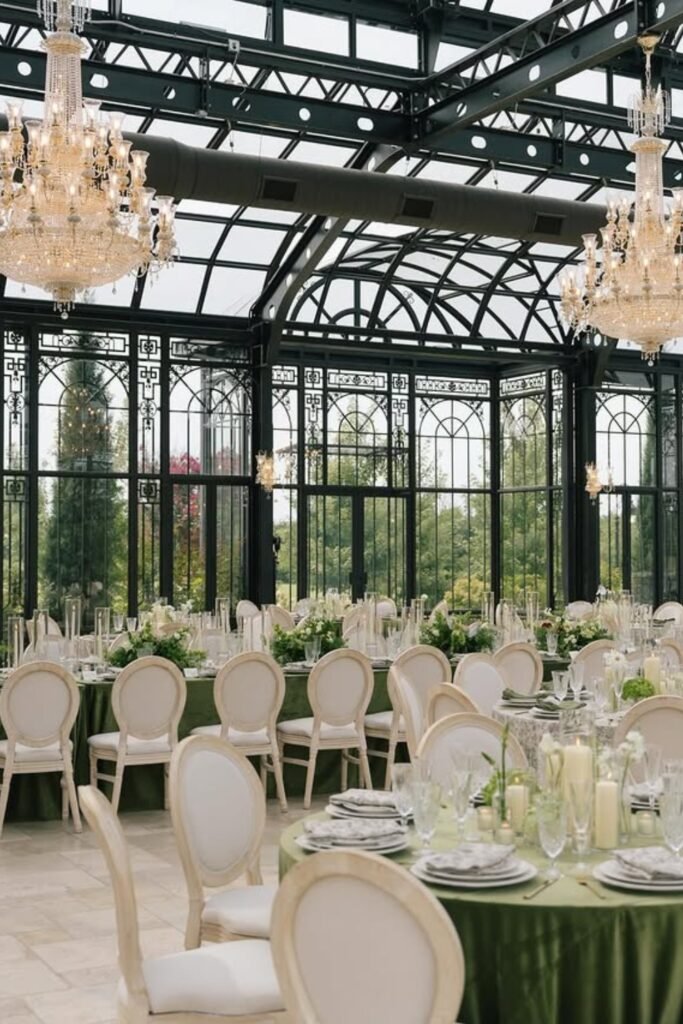 Crystal chandeliers paired with soft green linens bring structure and elegance, balancing the greenhouse’s glass walls with a refined, formal dining atmosphere.