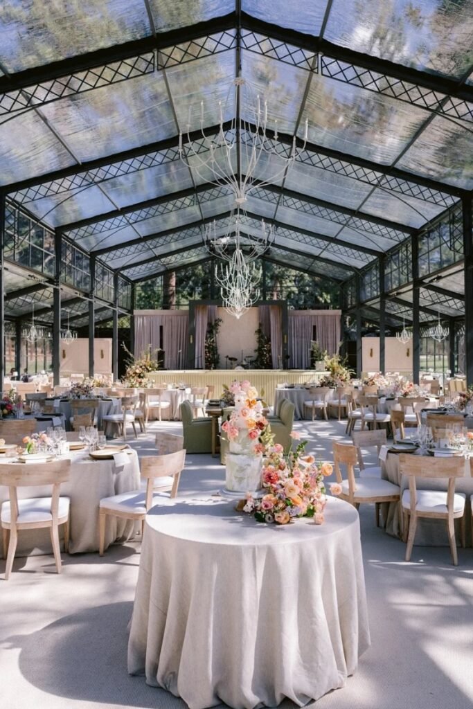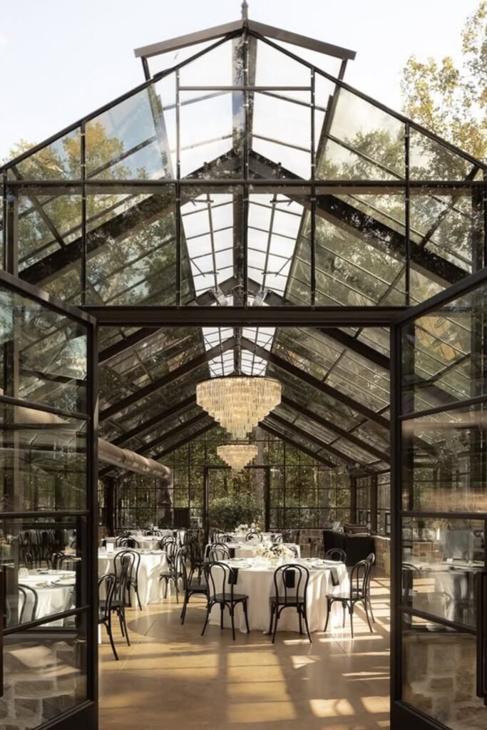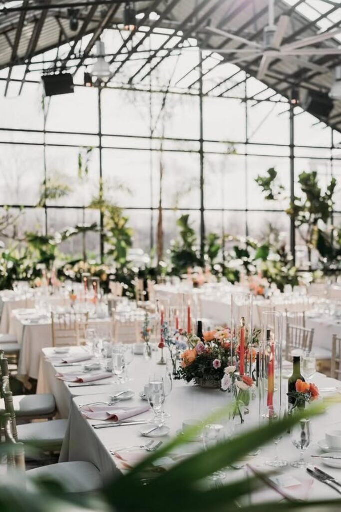 Round tables soften the strong lines of glass walls and beams, helping a greenhouse wedding feel balanced and welcoming for guests.
