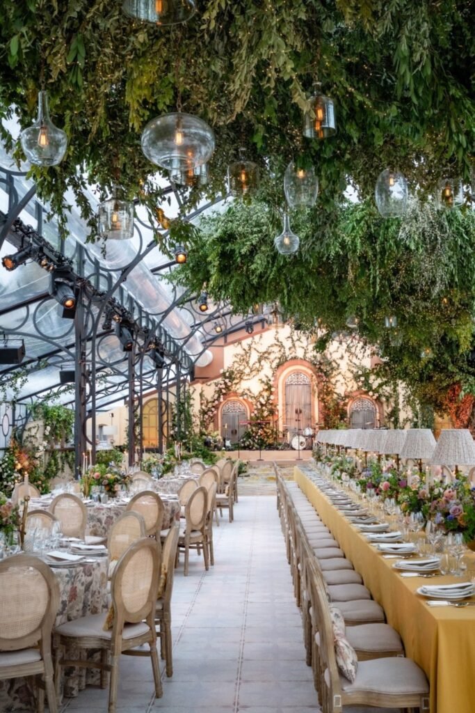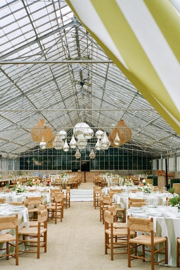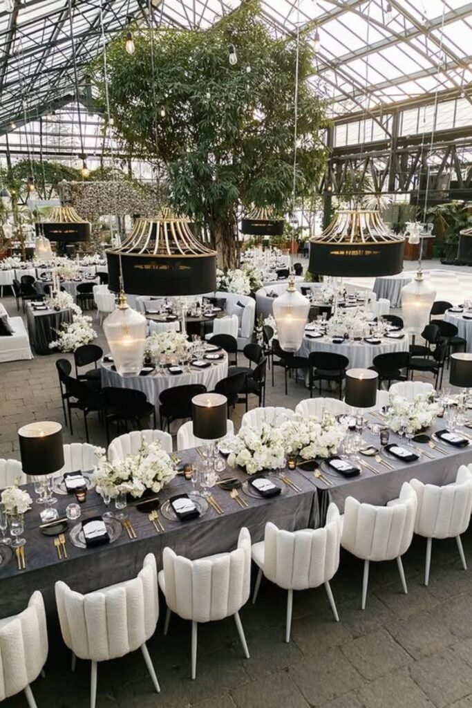 Bold pendant lighting helps define dining zones in a large greenhouse wedding, especially when the space feels open and visually expansive.