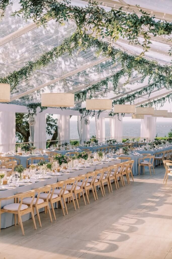 Long banquet tables work best here, guiding guests visually toward the couple and creating a shared, romantic dining moment.