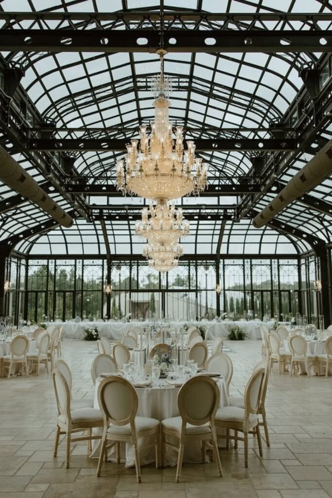 A wide-open greenhouse reception feels luxurious when round tables anchor the space, creating balance beneath dramatic chandeliers.
