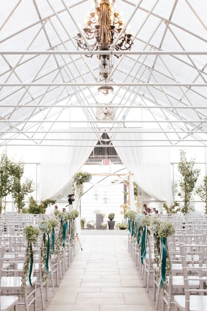 A large chandelier anchors a greenhouse wedding by creating a clear focal point that balances tall ceilings and open floor plans.