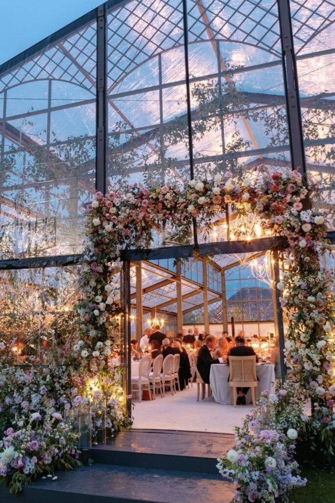 A greenhouse wedding entrance framed with lush florals instantly tells guests they’re stepping into something special and intentional.