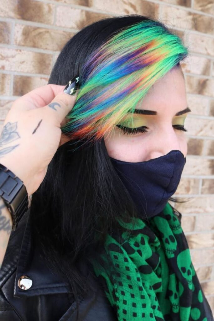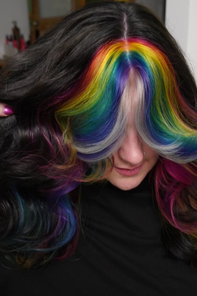 Add a pop of fun with hidden rainbow streaks beneath a sleek black top layer.