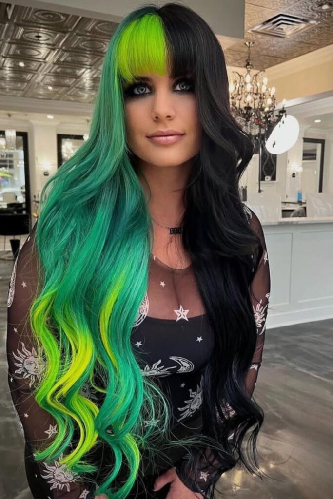 Make a bold statement with a split-dye look that divides your hair into vibrant neon green and jet black halves.