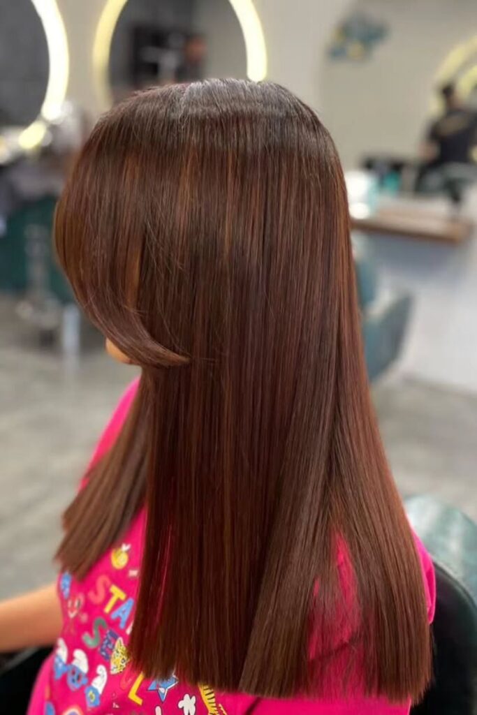 For this elegant, polished look, apply mahogany brown dye and maintain the glossiness with a light-reflecting hair oil.