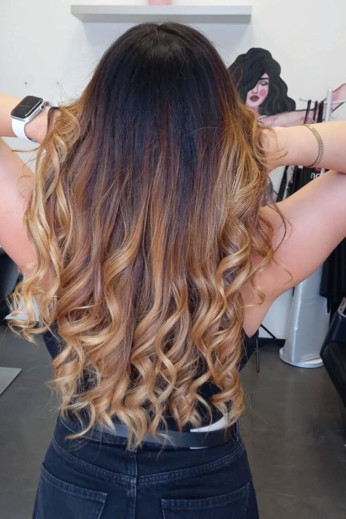Lighten your look with a soft honey ombre that transitions from a dark black base to golden caramel curls.