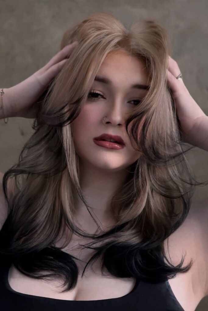 Get sun-kissed vibes with a sandy blonde balayage that softens black roots with warm honey tones.