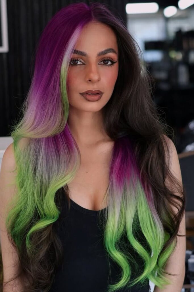 Bring bold energy to your style with electric green and purple dip-dye on jet-black hair.