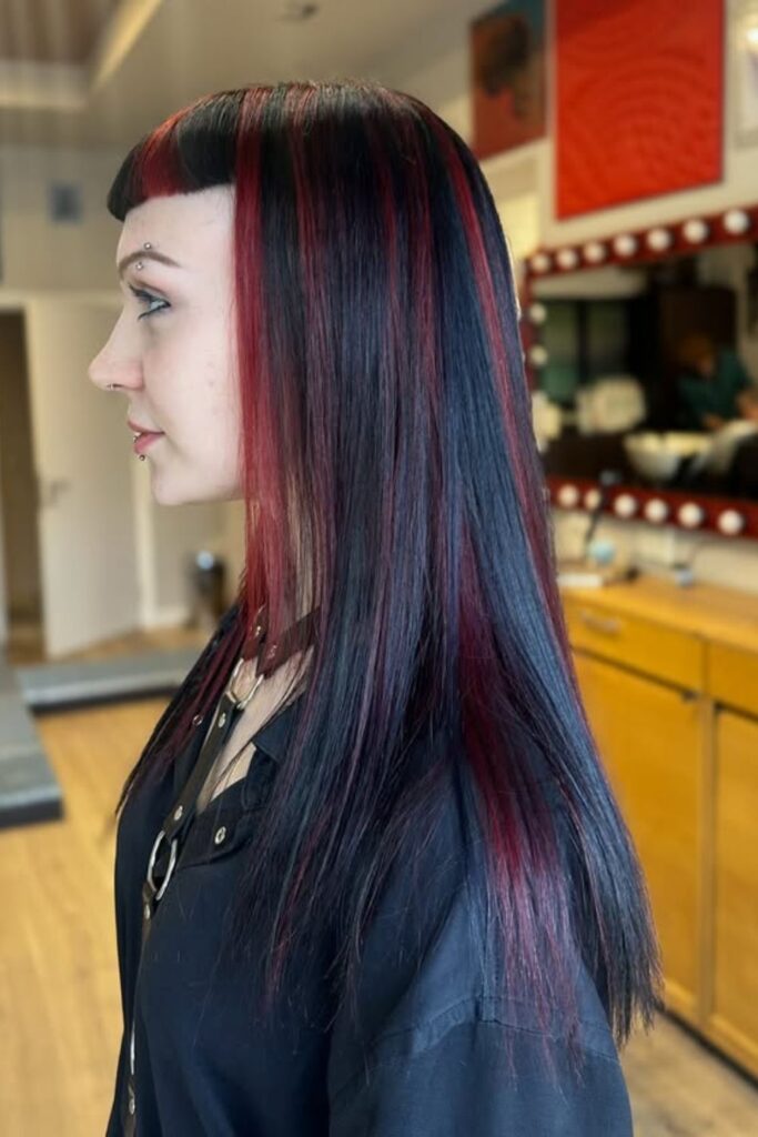 This edgy look pops even more with blunt bangs and straight styling, offering a gothic-meets-editorial finish.